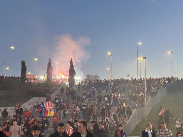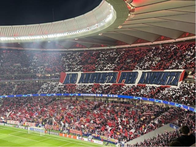 今年1月的国王杯马德里德比战前,马竞球迷就曾在大都会球场外制造“焰火墙”迎接球队的关键之战,本场对阵国米之前同样如此,去往球场的路上红色焰火随处可见,烟雾弥漫的阵势更能显现大战前夕的火药味。现场的国米球迷也有不少,他们在客场看台一度和南看台的马竞球迷形成隔空对唱的阵势。而马竞球迷的气势更足,全场球迷赛前集体举起围巾高唱队歌,在主场球迷营造出的氛围下,马竞在刚开场阶段就攻击性十足,前场的压迫让国米一度无所适从。虽然马竞很难从中路敲开国米的壁垒,但利诺和略伦特等人开场阶段在边路的攻势很凶,也迫使国米门将佐默做出扑救。